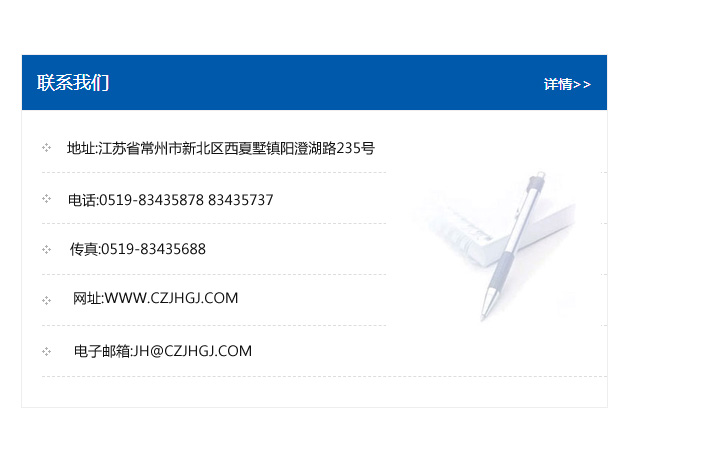 傳真:0519-83435688    郵編:213135    網址:WWW.czjhgj_com.gppz18.com    電子郵箱:JH@czjhgj_com.gppz18.com